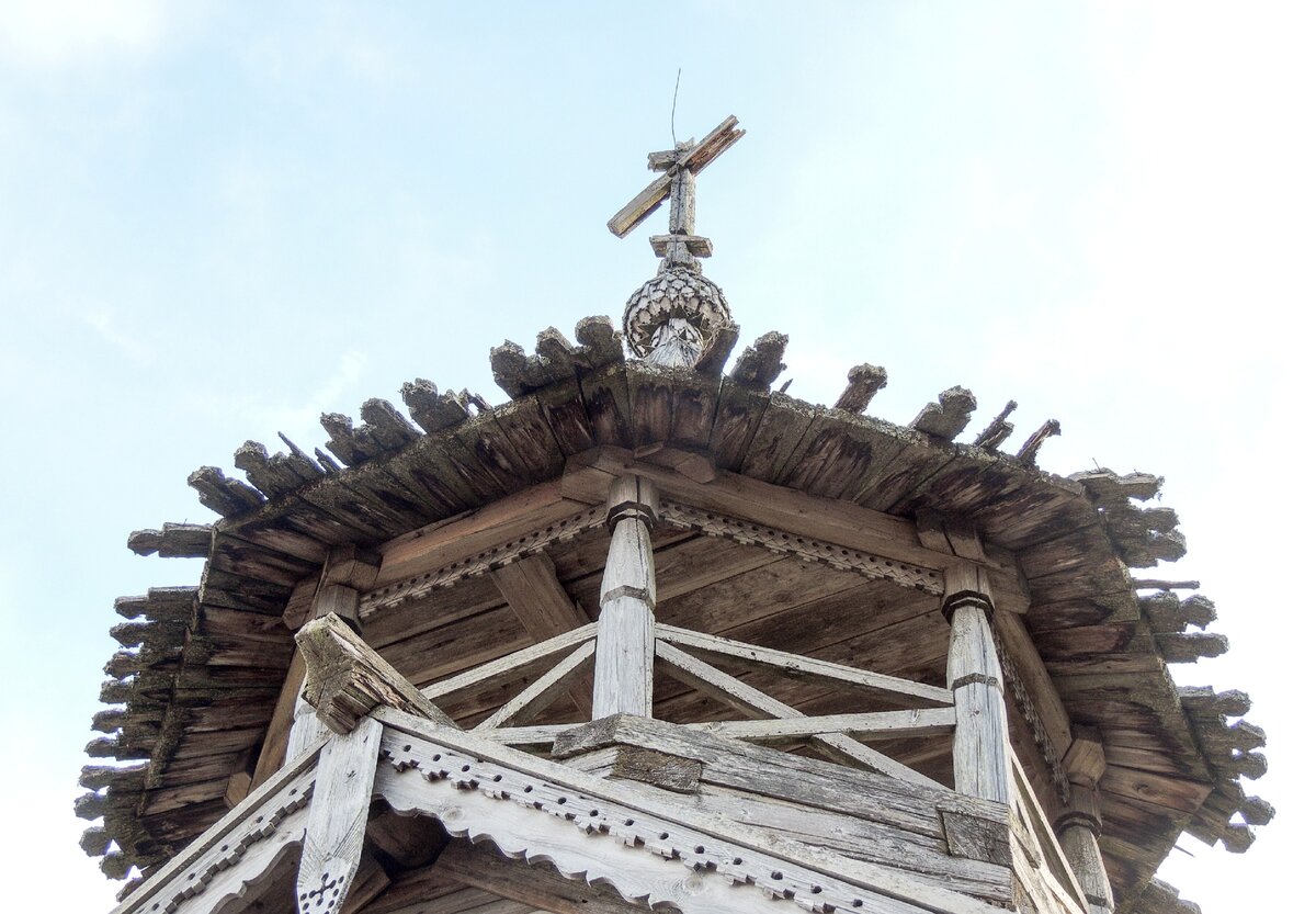 Переставляя на новое место главку, плотники срубили основание ее в виде расширяющегося книзу восьмеричка, который был покрыт лемехом. Остатки лемешин сохранились под нынешним железным покрытием.